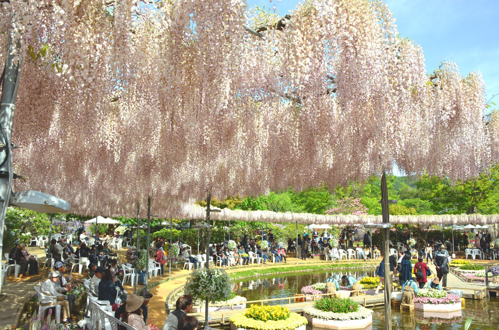 ピンクの藤棚下の休憩所。有名な滝藤だけでなく、園内には沢山の藤があるのじゃ。ここはぜひ一度行かれることをお勧めしますぞ。